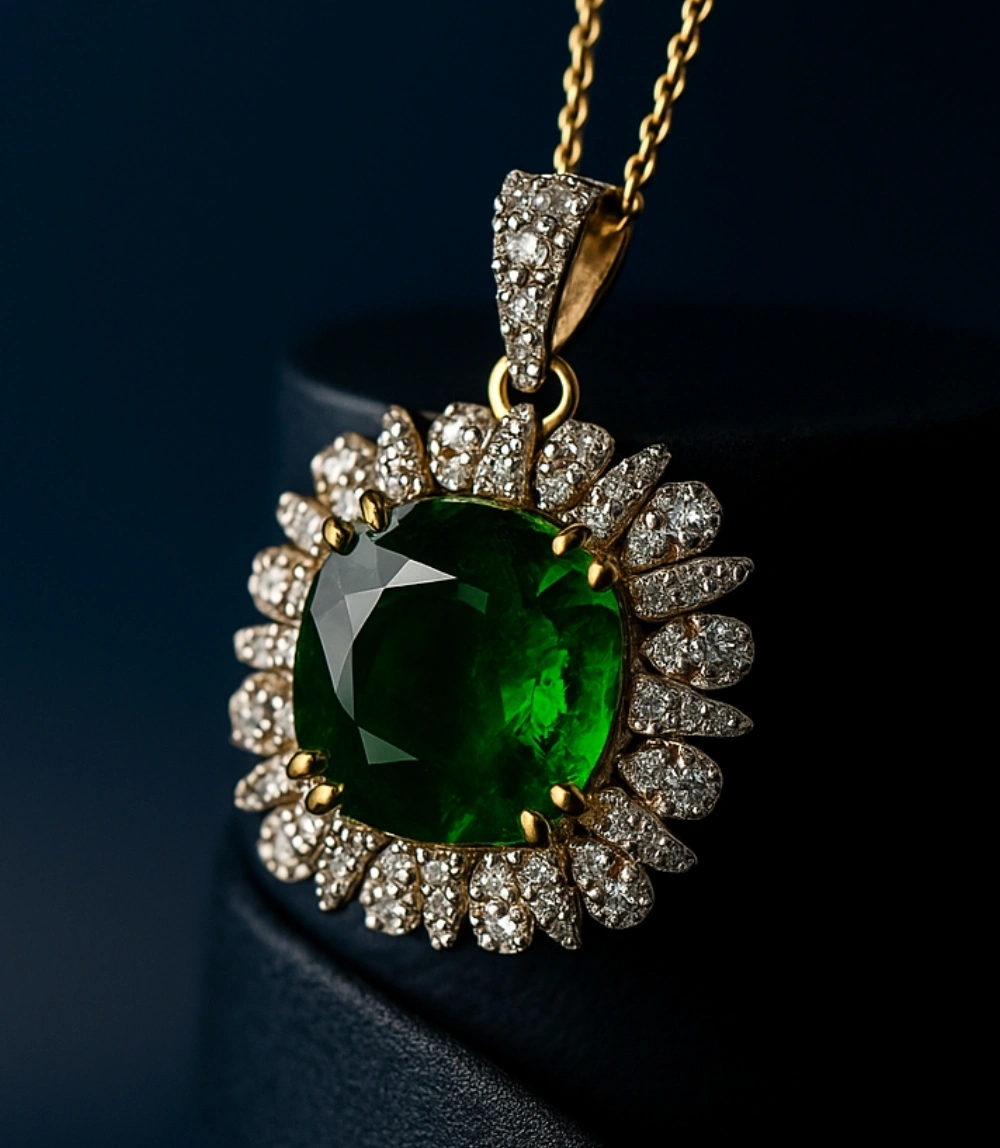 A stunning gold pendant featuring a vibrant green emerald stone surrounded by sparkling diamonds. Perfect for weddings, parties, and elegant wear.